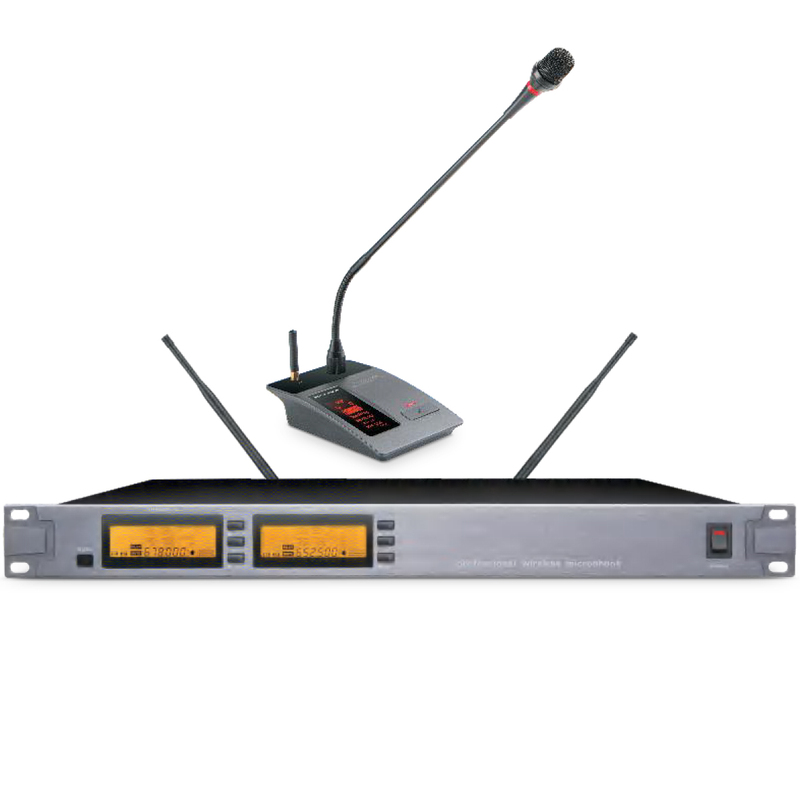 全金属底座,外置发射天线,宽40mm*高85mm点阵屏主界面,显示会议座电量/发言状况/时间 /工作频点/频率代码/信号强度